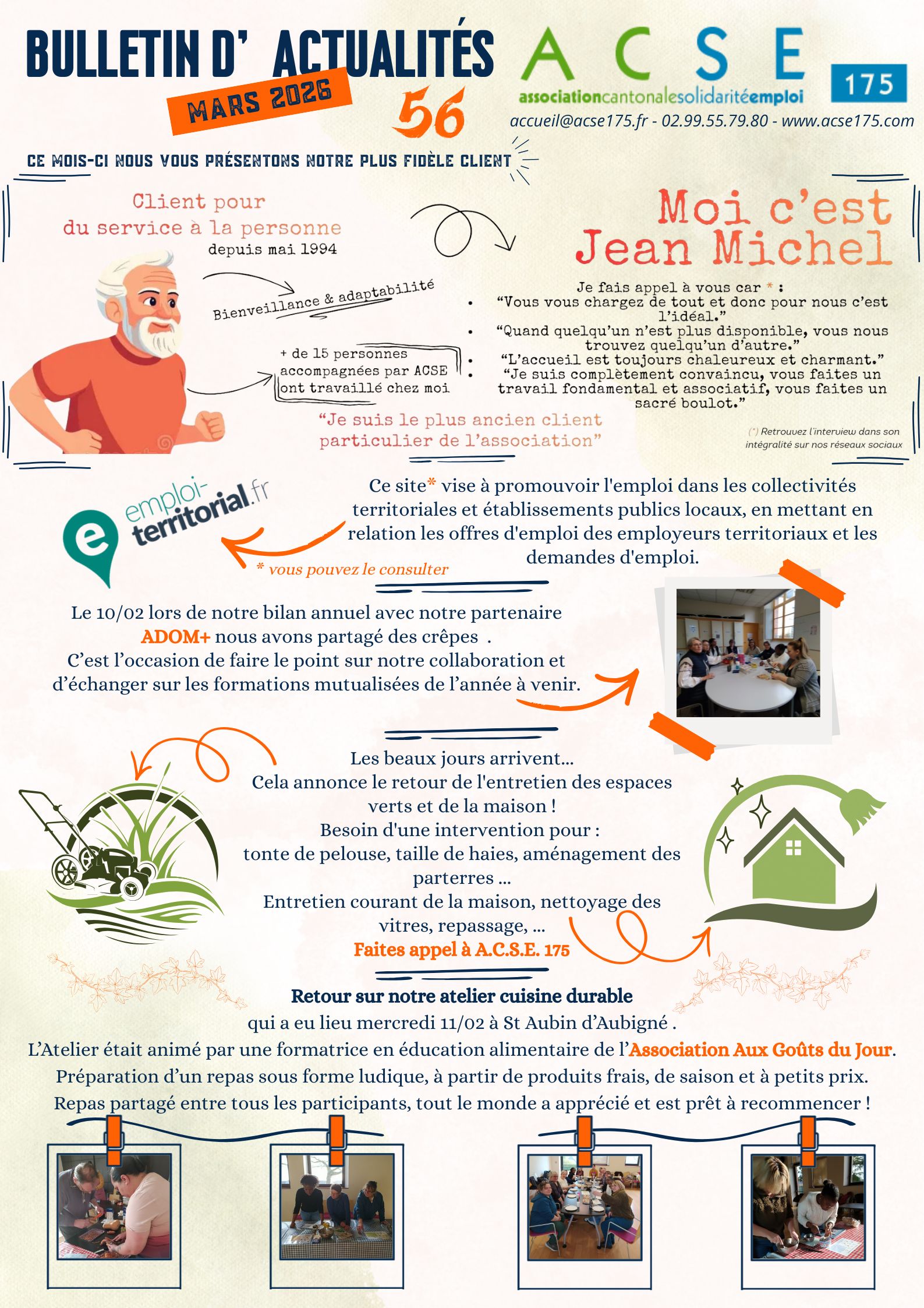 Bulletin d’Actualités n°56 – Mars 2026Publié le 3 mars 2026#emploi #acse175 #siae #formation #adom+ #partenariat #betton #staubinFacebookTwitterLinkedIn